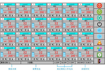 集中觸屏機箱系統(tǒng)升級優(yōu)化 ----TC3/2000系列如圖1所示此圖為觸摸屏人機交互的頁面,每個溫區(qū)的運行狀態(tài),設(shè)定的溫度,測量的溫度,輸出功率,以及輸出的電流相對應(yīng)的顯示在每個溫區(qū)對應(yīng)的界面中。用戶...